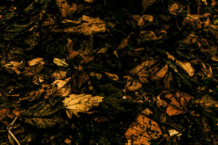 A close-up of a beautiful autumn forest floor covered in fallen leaves in shades of brown, orange, and gold