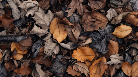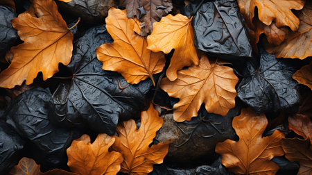 Fallen autumn leaves in rich shades of brown, orange, and yellow resting on a wet, dark ground create a vibrant natural tapestry, showcasing the beauty of the seasons change