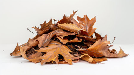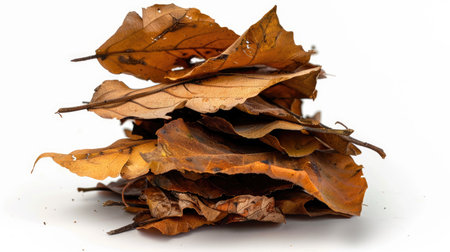 A beautiful arrangement of dry brown leaves forming a natural pile on a clean white background, ideal for autumn themes and seasonal designs.