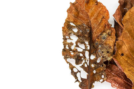 A beautiful arrangement of brown and orange autumn leaves piled together on a clean white background, highlighting the textures and colors of fall.