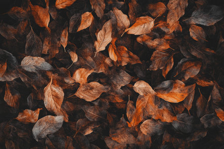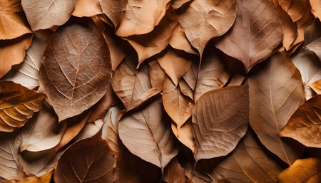 Textured dry leaves, layered earthy brown and orange tones with visible veins, autumnal and organic