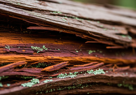 Weathered wood texture in extreme close up, revealing peeling layers of reddish brown and orange bark fibers covered in small patches of green lichen. rustic natural detail.