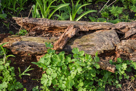 Remains of old mouldering cracked trunk of the withered tree lying on the ground among the young spring grass, background