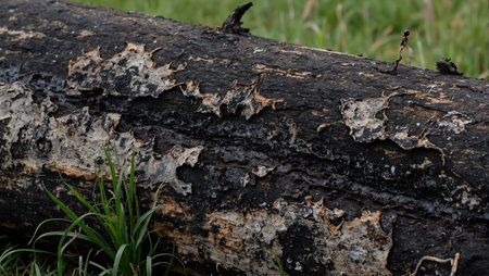 Charred log with exposed black scars surrounded by vibrant green grass tufts