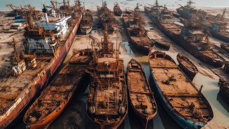 An abandoned shipyard rusted ships old cranes murky water industrial decay foggy atmosphere