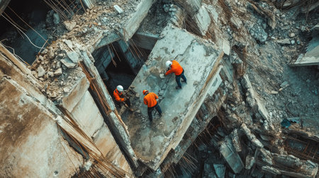Rescue workers assess a collapsed concrete structure after a disaster, showcasing teamwork and the urgency of recovery operations in a crisis situation