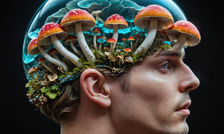 A mans head is covered in mushrooms