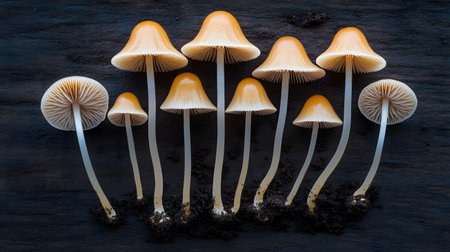 A cluster of delicate orange cap mushrooms emerges from dark soil. Their unique shapes and textures create a visually striking natural composition.