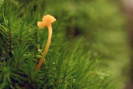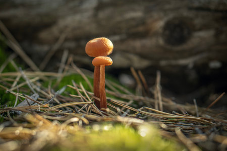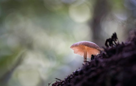 Back-lit tiny fungus growing on the forest ground. Nature out-of-focus forest background.