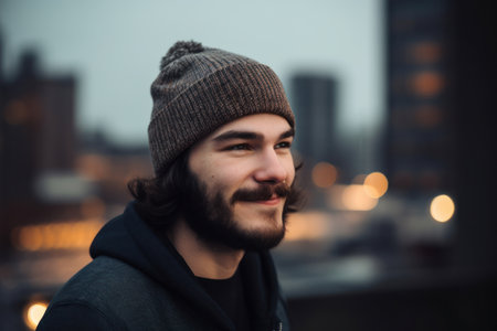 Close-up of a cheerful young adult enjoying the city ambiance with a warm, candid smile at dusk