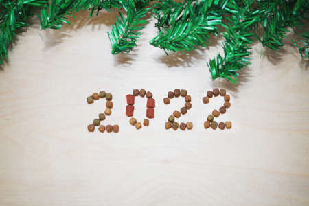 food for cats and dogs and the new year. Dry food label. Pet treats in 2022