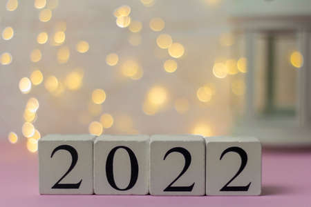 Happy New Year 2022.On a wooden perpetual calendar with a blurred abstract background with a bokeh with copy space