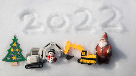 two models of toy excavators, a souvenir snowman, santa claus lie on the white snow. The numbers 2022 are written in the snow. card for Christmas business greetings in construction companies. Humor