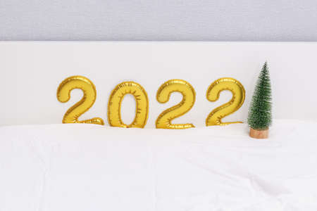 Number 2022 written with balloons, balloon foil, gold, white background, small green christmas tree