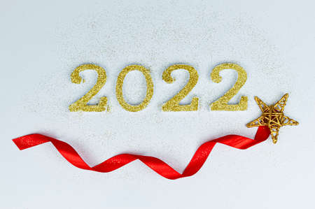 Flat lay composition with number 2022 and festive decor on white background. Happy new year