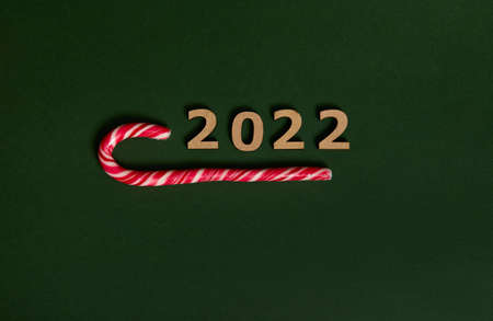 Conceptual studio shot of wooden numerals 2022 and sugary striped white and red Christmas lollipop, sweet candy cane, symbolizing New year and Christmas traditional event with space for advertisement