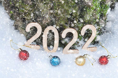 Hand drawn lettering 2022 on white snow surface. Winter holiday theme. View from above. Flat lay.