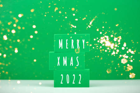 Merry Xmas 2022 concept in green colors with golden bokeh
