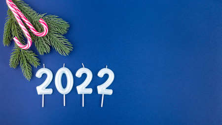 New year composition with pine branch, candy cane and candle number 2022