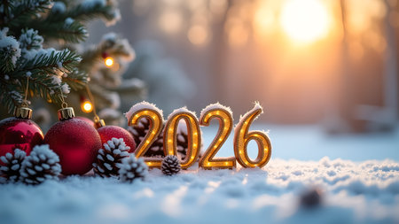 A festive winter scene showcasing the year 2026 amidst snow-covered ornaments, pinecones, and a fir tree. The golden light evokes a sense of holiday cheer and anticipation for the future.