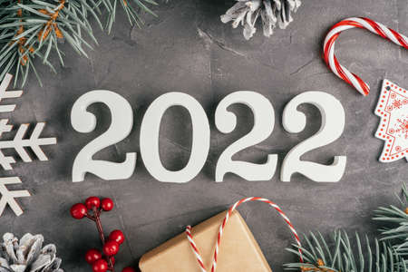Happy New Year 2022. White wooden numbers 2022 lying on gray uneven concrete surface with Christmas tree branches and decorations, lollipop and snowflake. Merry Christmas. Top view