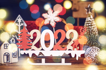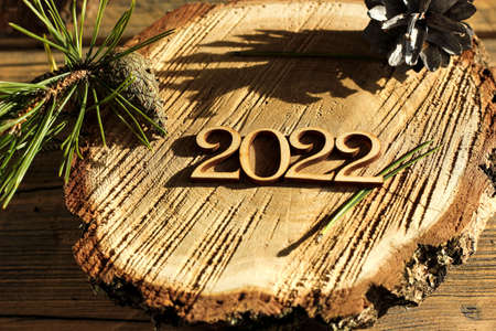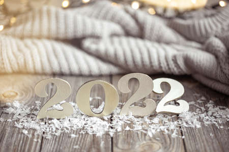 Cozy festive composition with the numbers 2022 on a wooden surface.