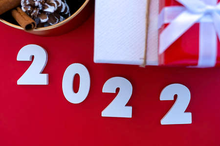 Flat lay format greeting card happy new year, numbers 2022 and gifts on red background with bokeh.