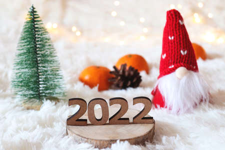 Funny New Year or Christmas greeting card with numbers 222 toy gnome, a Christmas tree toy and tangerines. Selective focus