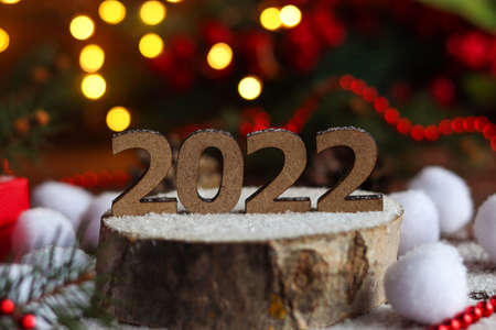 New Year card with number 2022 on wooden cut against festive background. Selective focus, copy space