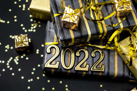 Boxes with Christmas gifts in gray and gold color on a dark background with the numbers 2022. New Years eve.