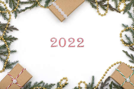 Layout, gift boxes with Christmas tree branches on a white background, 2022. High quality photo