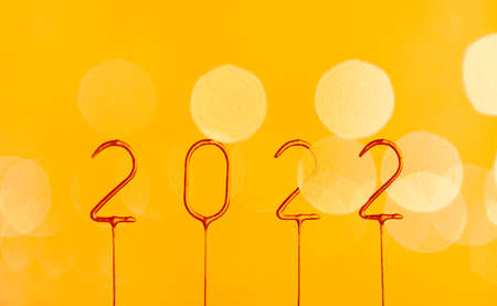Happy New Year 2022. Number 2022 made by candles on a festive sparkling bokeh background in the dark