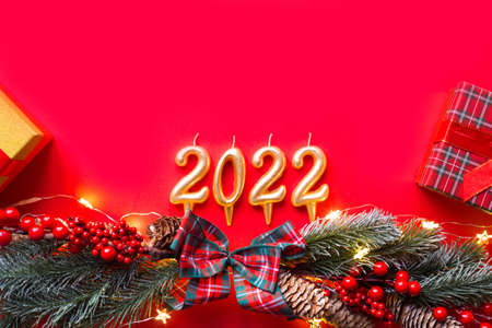 Happy New Year- golden candles numbers 2022 on a red background with Christmas tree, sequins, stars, glitter, gift boxes. Greetings, postcard. Calendar, cover.