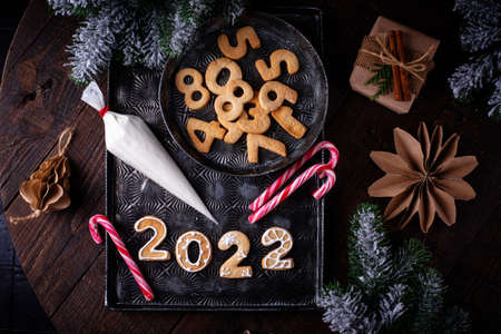 Gingerbread cookies in the form of numbers, gingerbread New Year 2022 and season festive decor on beige background. Top view. Flat lay