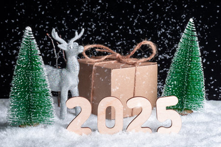 Creative 2025 Christmas card. A toy shining silver deer and gift box in the snow in the forest among the Christmas trees and wooden numbers 2025 at night. Santa's reindeer helper. Happy New Year