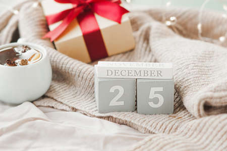 wooden square calendar cubes with the date December 25 on beige cozy crumpled blanket, gift with red ribbon and sparkling garland on background, selective focus