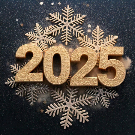 2025 New Year holidays concept. Golden numbers and glittering stars confetti.