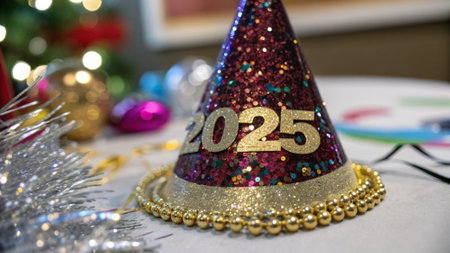 Cozy winter setup with a warm drink, festive decorations, and 2025 numbers.
