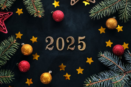 New Year 2025 dark background. Number of the coming year in Christmas decoration.