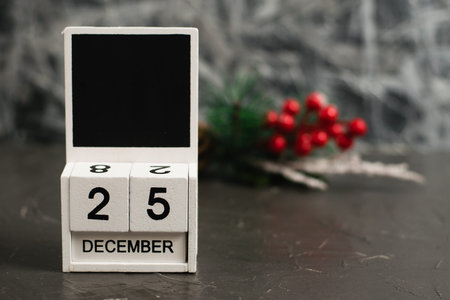 Wooden calendar with December 25 date and beautiful Christmas decoration on dark textured background with copy space.