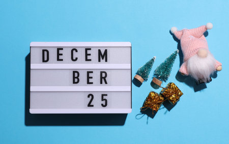 Lightbox calendar with text December 25 with Christmas, New Year winter decor on blue background