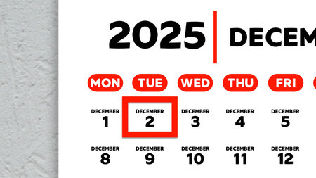 Close-up of the date December 2nd marked with a red cursor on the wall calendar 2025