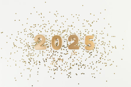 2025 Happy New Year. Top view of gold numbers, gold stars confetti on white background. Copy space, flat lay.