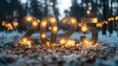 Illuminated 2025 New Year's Eve numbers in snowy forest at night