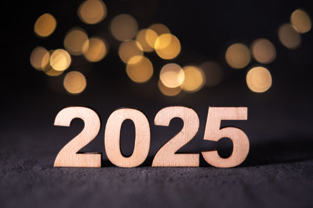 New Year 2025 in wooden numbers with bokeh.
