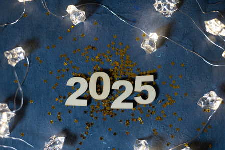 2025 new year wooden numbers with golden stars and light crystals