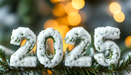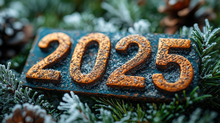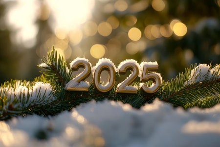 Wooden numbers 2025 surrounded by snowy fir branches of a Christmas tree in a festive setting