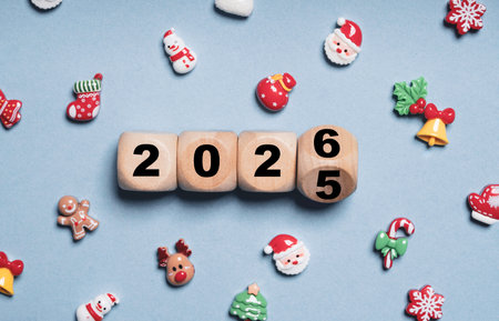 Wooden number blocks transitioning from 2025 to 2026 surrounded by festive Christmas ornaments represent the upcoming new year positive change celebration winter holiday spirit joy and new beginnings.