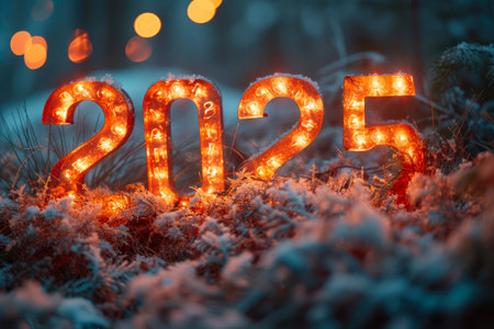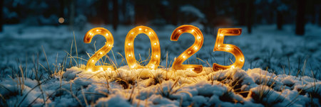 A lit up sign that says 2025 is on a snowy field. The sign is lit up with lights and is surrounded by snow. Concept of hope and new beginnings for the future