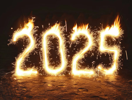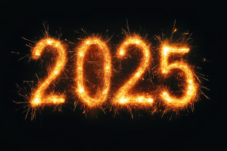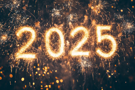 Sparkling 2025 New Years Eve Celebration With Fireworks From Sparklers On Dark Background